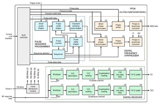 SDR, developed on the principle of a digital down-converter (DDC), performs the function of quadrature amplitude demodulation and filtering of the FID signal. This solution makes it possible to significantly reduce the length of the analog path of the NQR sensor, and thus to reduce the noise of the FID signal and the asymmetry of the parameters of its quadrature components. The obtained data come from the SDR outputs to the external hardware module DAQ through the corresponding FIFO buffers. For synchronous operation of all digital synthesis and processing modules, a clock distribution module is used, which operates from an external generator with a frequency of 100 MHz and provides the clock speeds: 300 MHz—for the SDR mixers; 150 MHz—for the operation of the DDS, decimation filters, analog-to-digital and digital-to-analog converters (ADC and DAC) and 15 MHz—for the operation of the SDR compensating filters.