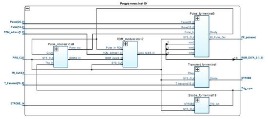 The configuration structure of the Programmer:inst19 module, which provides the formation of individual video pulses or their sequences, is shown in Figure 4. In fact, the considered module serves to control the first DDS channel (Figure 5), allowing the formation of excitation radio pulses of appropriate durations. Changing the logic level at the “Strobe_In” input starts the process of shaping the strobe pulse by the Strobe_former:inst19 module. This pulse activates the pulse counter in the sequence Pulse_counter:inst4, the source code of which from the output “ROM[4..0]” is fed to the non-volatile memory module ROM_module: inst17, and changing the level at the output “Pulse_out” leads to the activation of the video pulse generator Pulse_former:inst9. The operating principle of the latter is described in detail in [19]. Code words with data on the duration of the 90° pulse and the pause between the first and second pulses in the sequence are sent from the main interface controller (inst5 in Figure 3) to the inputs “Pulse[15..0]” and “Pause[26..0]”, respectively. This ensures the formation of the 90° radio pulse with a duration of 0.1 μs–100 μs and the first pause with a duration of 0.1 μs–500 ms [22]. Data on the duration of other pulses and pauses in the complex specialized sequences for NQR excitation and spin echo study are stored in non-volatile memory (inst17 in Figure 4) and read in accordance with the code at the “ROM_adress[1..0]” input. The total number of pulses in the sequence is not fixed and, due to the ability to quickly change the FPGA configuration, can be set depending on the experimental conditions. The Transient_former:inst module serves to further increase the duration of the excitation pulses due to the need to close the receiver of the sensor during the action of the transient process in its input circuit [23]. Additional gain in duration can be set in the range of 0.1 μs–10 μs.