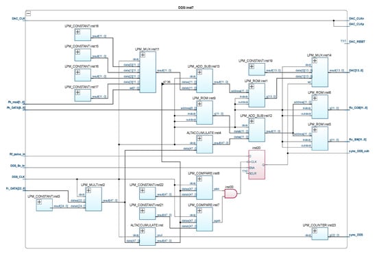 Consider the configuration structure of the FPGA-based DDS (Figure 5), in particular its first channel, which is used to generate NQR RF excitation pulses. The output quasi-harmonic signal of the first channel of the synthesizer is formed by an external 14 bit digital-to-analog converter connected to the “DAC[13..0]” output. The digital code is read from the read-only memory (ROM) LPM_ROM:inst1, in the cells of which the values of the coefficients of the sinusoidal signal are pre-written, and whose capacity determines the number of steps of the approximated sinusoid. The 48 bit phase accumulator ALTACCUMULATE:inst is a register whose content increases linearly over time with an adjustable increment. In this case, the binary code at the output “result[47..0]” of the phase accumulator is the code of the instantaneous phase of the generated signal, the frequency of which is proportional to the rate of phase change in time, and the phase gain is the code of the output frequency.