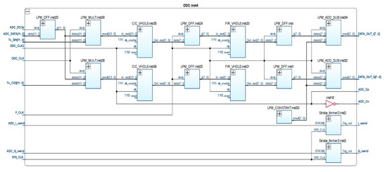 The CIC_VHDL5:inst35 and CIC_VHDL:inst36 modules are five-stage integral-comb filters with infinite pulse response, used to reduce the bit rate to 8 bit and the sampling rate to 15 MHz signals from the multiplier outputs. The latter allows the filtering of the demodulated signal from the spectral components of the higher orders [29]. The uneven amplitude–frequency response of CIC filters necessitates the use of additional compensating filters. The proposed configuration structure of the digital receiver uses non-recursive compensating filters of the 55th order with a final pulse response (modules FIR_VHDL5:inst20 and FIR_VHDL5:inst21 in Figure 6). The data coefficients of FIR filters are calculated in MATLAB FDATool. Earlier, we described the processes of simulation modeling and the synthesis of SDR filters in MATLAB Simulink in more detail [28,29].