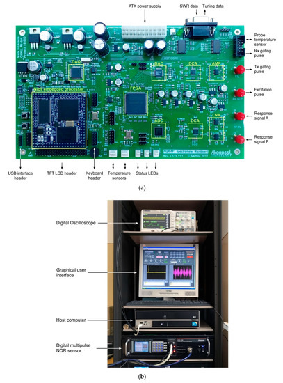 Photo of the experimental setup for the study of the proposed configuration structure of the FPGA: (a) view of the NQR sensor motherboard; (b) measurement setup for the observation of NQR.