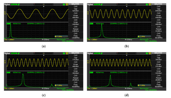 Experimental waveforms of signals generated by the first DDS channel of the proposed FPGA configuration structure: (a) 10 MHz; (b) 30 MHz; (c) 40 MHz; (d) 50 MHz.