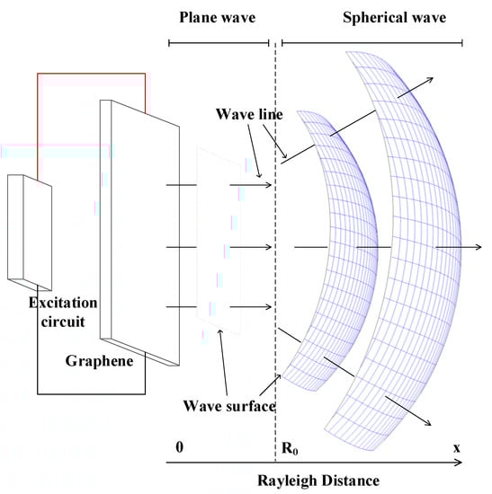 The working principle of graphene thermoacoustic speakers is shown in Figure 1. When an alternating current is applied at both ends of graphene film, the surface of graphene transfers heat to the surrounding medium periodically, which causes the medium to expand and contract periodically. In the process, the electric energy is converted into thermal energy, and a periodic thermal gradient is formed between the thermoacoustic speaker and the surrounding air. The sound wave is produced by the periodic contraction and expansion of the medium caused by the thermal gradient. The sound wave is a plane wave in the Rayleigh distance (R0 = s/λ), and is a spherical wave outside the Rayleigh distance.