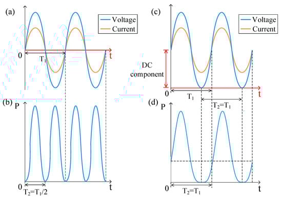 The curves of (a) voltage, current and (b) electric power under pure AC excitation, and the curves of (c) voltage, current and (d) electric power under AC and DC excitation.