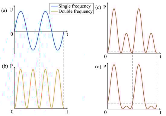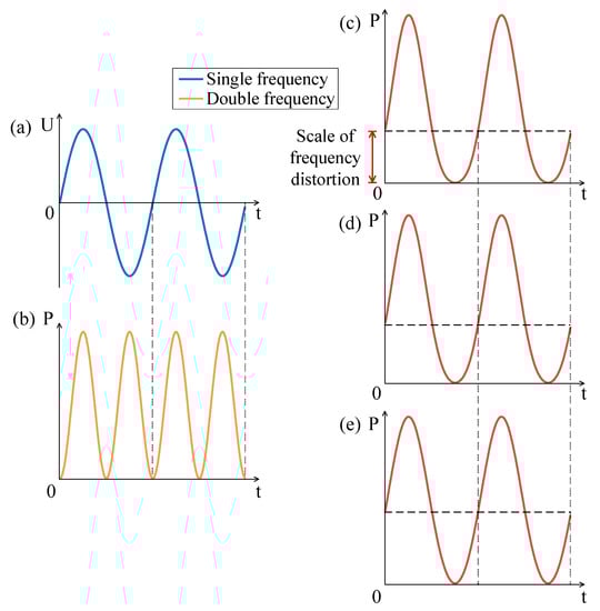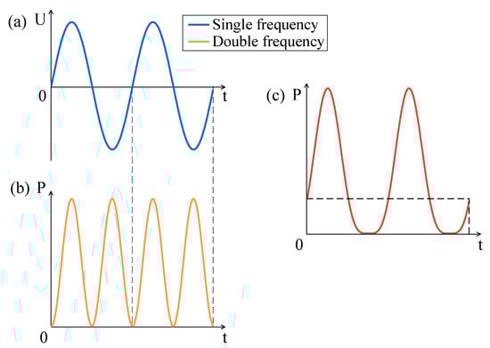 It can be seen from Equation (2) that the frequency of electric power PA is twice that of AC excitation. In addition, the frequency of sound pressure is the same as that of electric power, so the frequency of sound pressure is twice that of AC excitation, as shown in Figure 2a,b. In order to suppress the frequency doubling effect, a DC bias excitation is used to superimpose the AC excitation.
