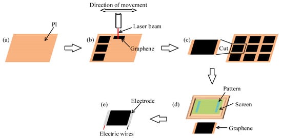 Laser scribing technology was chosen to prepare graphene thermoacoustic speakers in only one step []. The technology can be carried out directly in the air environment without high temperature or preliminary preparation [,]. The designed graphene array diagram was firstly imported into the Scarve software. As shown in Figure 6a, after the PI (polyimide) film was prepared, the laser beam was adjusted and focused on the PI film, and the scribing process was automatically completed as shown in Figure 6b. Kapton PI films were produced by the DuPont Company. The thickness of the PI films was 75 μm. The power of the laser was 10 W. The CO2 concentration of the CO2 laser was 20%, and N2 concentration of the CO2 laser was 15%. Then the desired shape or size of graphene was cut from the PI film as shown in Figure 6c. A certain width of PI film on both sides of the graphene was reserved, which was convenient for the preparation of conductive electrodes.