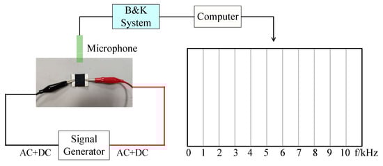 For pure AC excitation, for example, the frequency of the signal generator was adjusted to 1 kHz, and the computer only displayed the output sound pressure of 2 kHz. For AC/DC superimposed excitation, the frequency of the signal generator was also adjusted to 1 kHz, which was superimposed with a certain DC bias, and the computer both displayed the output sound pressure of 1 kHz and 2 kHz.