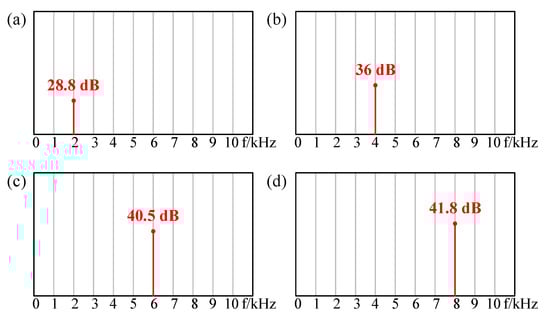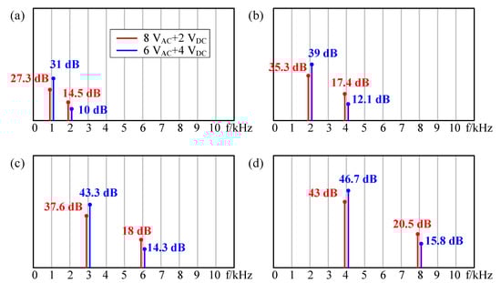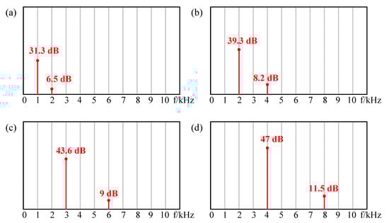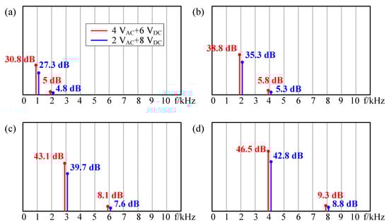 Firstly, a large AC signal and a small DC bias were used as excitation. As shown in Figure 10, the red lines indicate that the input excitation signal is 8VAC + 2VDC, and the blue lines indicate that the input excitation signal is 6VAC + 4VDC. As shown in Figure 10a, when the input AC frequency was 1 kHz, the frequency of sound pressure was both 1 kHz (single frequency component) and 2 kHz (double frequency component). However, the double frequency component was smaller than the single one (red one: 27.3 dB @ 1 kHz and 14.5 dB @ 2 kHz; blue one: 31 dB @ 1 kHz and 10 dB @ 2 kHz), that is, the single frequency was dominant and the double frequency was suppressed. With the increasing of DC bias, the frequency doubling effect was suppressed better. This is consistent with the results of Figure 3. When the input AC frequency was 2 kHz, 3 kHz, and 4 kHz, respectively, the same conclusion could be obtained according to Figure 10b–d.