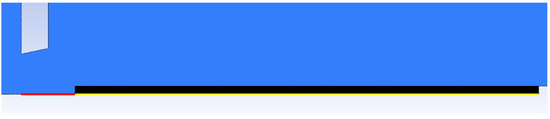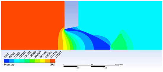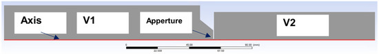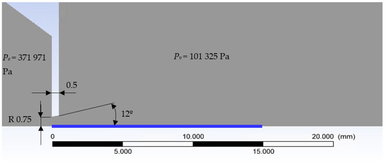 Boundary conditions are described in Figure 3. The mesh was formed from hexagon elements of 0.5 mm in size in rectangular sections. The narrowing region with aperture was created from triangular elements with a gradual refinement, a growth rate of 1.05 to an element size of 0.01 mm in the aperture region, and the region of supersonic flow behind the aperture. Monitor check convergence absolute criteria were set to 0.001 for continuity and velocity. The value for energy was set to 1 × 10−6.
