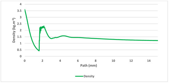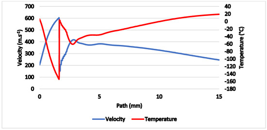The gas flow running through the nozzle described above is a typical example of a critical flow [11,12]. Figure 5 shows the path behind the nozzle without the probe inserted, on which the course of pressure, Mach number (Figure 6), temperature, velocity (Figure 7) and density (Figure 8) are calculated.