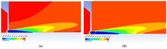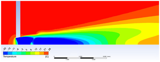 Previously shown results (Figure 6 and Figure 7) show that in 1 mm distance from the critical cross-section of the nozzle at the location of the head of the cylindrical probe the static temperature reaches T = −108 °C (165 K) and velocity reaches Mv = 2. This means the stagnation temperature is Tstg = 17 °C (290 K), which can be seen in Figure 18. The stagnation temperature is 17 °C because the following temperature drop is caused by the cooled probe behind the shockwave as seen in Figure 17a.