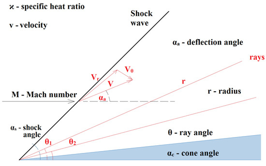 where ϰ is the specific heat ratio, v is velocity, M is the Mach number, s is shock angle, a is the deflection angle, r is the radius, θ is the ray angle and c is the cone angle.