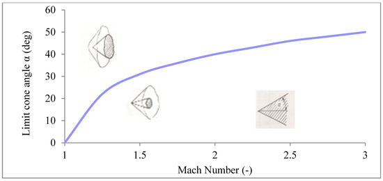 The relationship between the cone angle and the shock angle and thus the point of the detachment of the shockwave and its change from conical shockwave to perpendicular shockwave is described by the Taylor–McCall theory as shown in Figure 12.