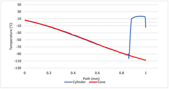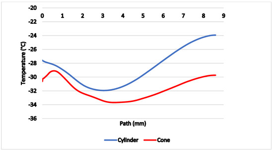 Figure 16 shows comparison of temperatures along the axis of the probe with thermocouple (yellow path), proving the conical probe reached lower temperatures by 2 to 3 °C on average compared to the cylindrical probe.