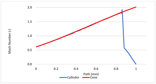 Another way to compare the results from the mathematical-physical analyses with the theoretical ones can be the comparison of the Mach number of both probe variants. According to the results, the conical probe does not affect the flow thanks to the conical shockwave and the cylindrical probe slows the flow down to the stagnation velocity, as shown in Figure 20.