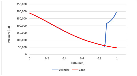 In Figure 14 and Figure 15, there are paths highlighted in red and yellow for which all calculations were performed. The red path is 1 mm long and leads from the critical cross-section of the nozzle to the tip of the probe. The yellow path is 8.6 mm long and runs along the axis of the probe.