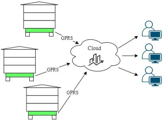 The basic components of typical electronic scales are weight sensors, electronics for data processing and transmission control, and the transmission module [12]. The data are sent to a dedicated cloud that archives all the measurements and makes them available for further complex analysis. The cloud also stores configuration data for devices working in the network (Figure 1).