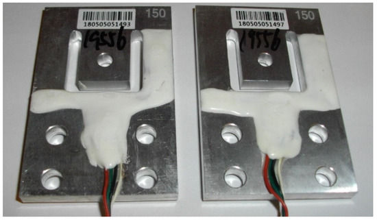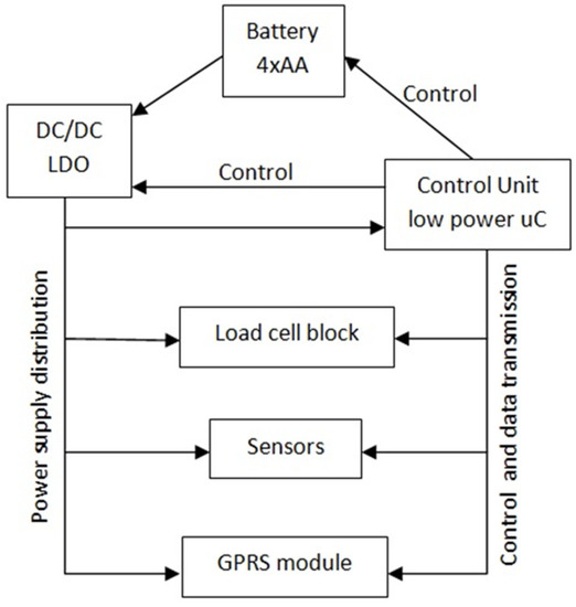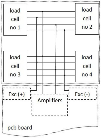 The main measuring instruments of the system are strain sensors—the load cells. Special sensors modified and customized by the manufacturer were selected so that they could sustain a very long-lasting mass load, exhibit nearly zero balance, and demonstrate a fast response time, as well as providing temperature compensation in the range of −10 °C to +40 °C; the resistance of individual sensor is approx. 350 Ohm. The voltage outputs from the load cells are connected to the amplifiers and next to the main board with a microcontroller to be subjected to analog-to-digital conversion at the end (Figure 7).