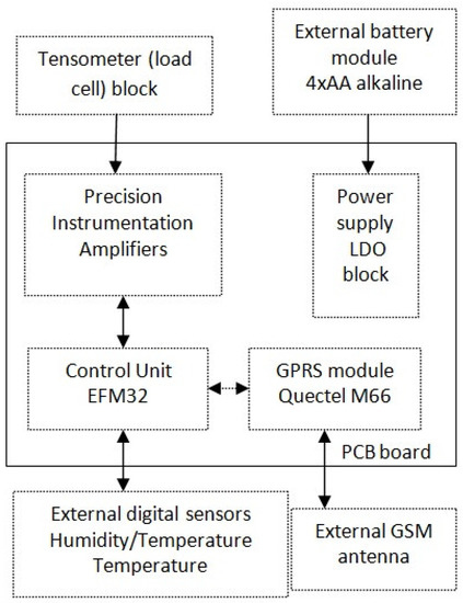 The general requirements defined at the beginning of the work for the electronics of the smart beehive scale allowed for the determination of the more detailed main electronic blocks (Figure 6). It was decided to use the GS standard for wireless communication, whereas for the power supply alkaline AA batteries were chosen, as one of the most popular, easily available, and inexpensive energy sources.