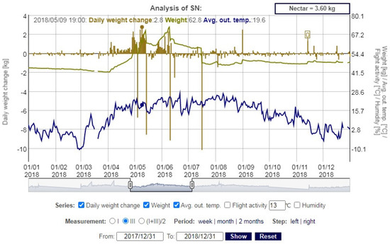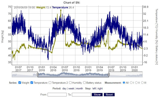 Based on the transmitted data by beehive scales, users can observe the daily changes in the hive mass simultaneously with other measured parameters, which allows them to monitor the state of the bee colony in the current environmental conditions (Figure 12).