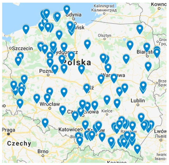 The tests were carried out for selected 85 devices deployed in Poland and operating in the years 2017–2020. The cases where battery replacement resulted in losses in the continuity of measured and transmitted data were not taken into account during analysis. The locations of the deployed beehives equipped with the designed smart scales and participating in tests during the period of 2017–2020 and described in the previous section are shown in the map in Figure 13.