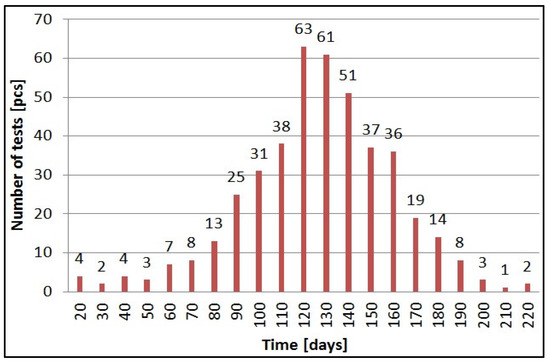 The diagram below (Figure 14) shows the real operating time for the beehive scales powered by four AA alkaline batteries. The term “test” refers to lifetime (the full operation period) of a beehive scale, which is fed by (which runs on) one set of batteries. The presented data relate to 430 full periods of operation for 85 devices. The mean time duration of operation was 131 days with a standard deviation of 30 days.