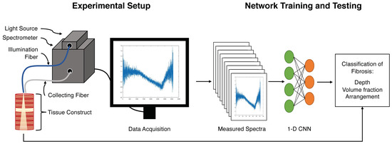 While most LSS systems require only basic optical components, analysis and interpretation of the acquired spectra are often based on simplistic models and time-consuming simulations of light-tissue interactions, for instance, Monte Carlo methods. Also, analyses were developed focusing on specific scatterers, e.g., superficial nuclei. A general framework for analyses of the spectra from cardiac tissues has not been introduced. In many biomedical fields, machine learning has been proposed and is increasingly applied to overcome similar challenges. Various approaches of machine learning have been applied, e.g., for the detection of bacterial serotype based on optical scattering, diagnosis of ischemic heart disease from electrocardiograms, and human joint classification from diffuse reflectance spectroscopy [10,11,12]. In our prior work, we applied a machine learning approach, i.e., a convolutional neural network (CNN), to detect fibrosis in images from catheterized FCM of the beating heart in situ in an animal model [13].
