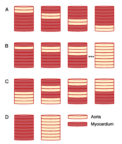 Tissue constructs. (A) For studies on depth detection of insets of fibrotic tissue, two 200 µm thick sections of aortic tissue were placed at various locations within the 1.6 mm thick constructs. (B) Tissue constructs for analysis of LSS sensitivity for volume fractions. The sensitivity was evaluated by successively increasing the ratio of aortic tissue to the myocardium. (C) Permutated tissue section arrangements were used to assess the sensitivity of LSS to tissue heterogeneities. (D) Constructs comprising only myocardial and aortic tissue sections complemented the constructs in (A–C) in all the analyses.