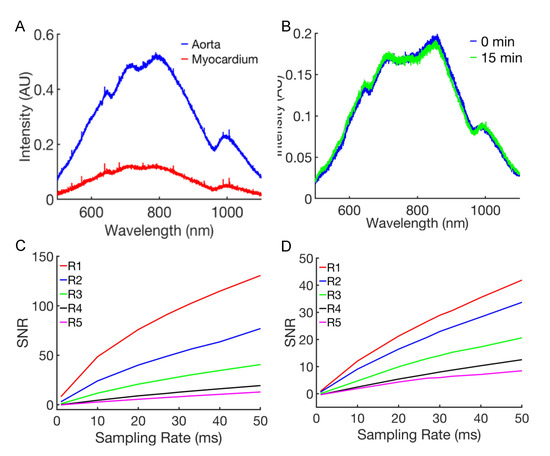 Spectroscopy of the aorta and ventricular myocardium from a rat. (A) Raw reflectance spectra from live aorta and live ventricular myocardium. The spectra were pronouncedly different. In particular, the spectrum from the myocardium exhibited smaller intensities than the spectrum from the aorta. (B) Differences between raw spectra from the myocardium before and after 15 min of fixation with paraformaldehyde were marginal. (C,D) Signal-to-noise ratio (SNR) for collection fibers R1 to R5 and various sampling rates measured using the (C) calibration standard and (D) fixed ventricular tissue.