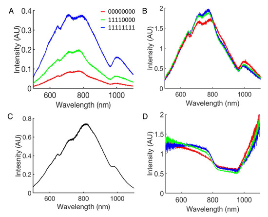Processing of spectra measured from tissue constructs with different ratios of myocardium to aortic tissue. (A) Raw spectra from construction of 100% myocardium, 50% myocardium/50 aortic tissue, and 100% aortic tissue. (B) Spectra from (A) after normalization. (C) Spectrum measured from calibration standard. (D) Spectra from (B) after calibration using the spectrum from (C).