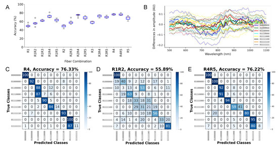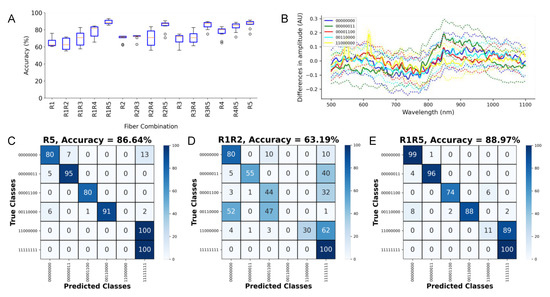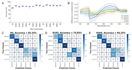 Finally, we configured the tissue constructs as presented in Figure 2C to measure the spectra for training and testing of the CNN. The training spectra are shown in Figure S5. The accuracies for permutated tissue arrangements are presented in Figure 7A. Figure 7B presents the differences between the spectra from the various constructs and the construct 11111111. The highest single and combined fiber accuracies were 82.33 ± 0.97% and 84.25 ± 1.88% for R4 and R3R4, respectively. The confusion matrices for these networks are shown in Figure 7C,E. The lowest fiber combination accuracy was 75.83 ± 1.58% for the combination R1R3 (Figure 7D).