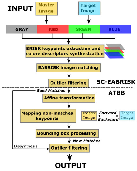 Automatic remote sensing optical image matching is fundamental and crucial for many spatial applications. In addition to the reliability and robustness of the local features themselves, the efficiency of the data processing step has gained more attention in recent years [4]. This paper aimed to develop a systematic workflow that is able to adopt a portion of the most robust keypoints and a subsequent geometric mapping to generate the greatest number of feature correspondences. Different from previously advanced studies that used only grayscale images for feature detection and descriptor formation [4,44], this study aimed to also synthesize color information extracted from R-G-B images into the feature descriptors acquired from the grayscale image to improve their robustness by utilizing BRISKs.