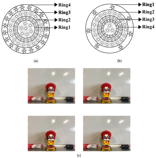 Separating 64-byte BRISK feature descriptors into four rings using grayscale image: (a) the sorting ring pattern, (b) the inverse sorting ring pattern, and (c) scene changes from blurred to clear.