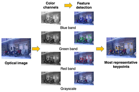 Converting an optical image into a single grayscale channel is the most widely adopted approach for performing image matching, but the R-G-B color information is neutralized. According to [60], however, a feature point in a grayscale image may behave differently in the R-G-B channel spaces in terms of the properties extracted in the feature detection stage that computes scale and orientation invariances. This finding also implies that the feature descriptors of the feature points acquired from different color channels can be different. Color information, hence, can be considered useful for supporting the grayscale image for increasing the distinctiveness and robustness of the feature point.