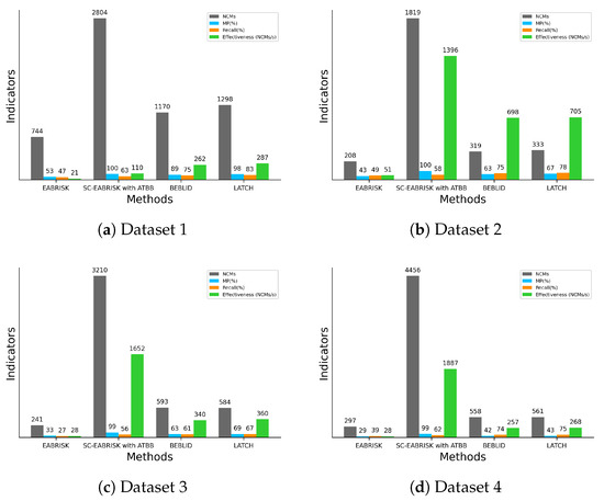 To assess the performance of the proposed method, this paper compares the results derived from the EABRIAK, SC-EABRIAK with ATBB, BEBLID, and LATCH algorithms separately and investigates their differences in terms of NCMs, MP, recall, and effectiveness. Figure 7 presents the numerical analysis of the image matching results. Figure 7a shows that both the BEBLID and LATCH methods present better recall and efficiency values than the SC-EABRISK with the ATBB method, but the proposed schema can acquire more feature correspondences in this case. For the remaining results, this study investigates that the proposed SC-EABRISK with ATBB method shows better performance as the imagery scenes become more complex. In addition, the recall values obtained by using the SC-EABRISK with ATBB method may not be very high (e.g., 100%) because some of the matches are filtered either by the bounding box or via outlier removal. Therefore, the recall values in these experiments range from 50% to 60%, meaning that half of the keypoints within an image pair can be matched to their correspondences successfully. The high recall values presented by the BEBLID and LATCH approaches in all image pairs show their ability to improve the feature descriptors. Based on these experiments, this study also observes that both the BEBLID and LATCH approaches have approximately comparable performance for image matching.