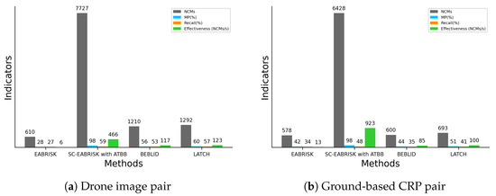 Figure 9 presents the numerical analyses of the four indicators to evaluate the performance of the proposed algorithm. Based on the results, the SC-EABRISK with ATBB method shows better performance than the EABRISK, BEBLID, and LATCH approaches in terms of the NCMs, MPs, and efficiency. Similarly, the BEBLID and LATCH methods show similar capabilities for image matching when using the CRP dataset. In these two imagery datasets, however, the recall values of all four methods become lower than the benchmark datasets. Because the CRPs are captured from different positions with different viewing angles, the correspondences of some keypoints are not available. In addition, the impact of uniform textures may lead to mismatches when the viewing position and angle between the two CRPs are different. However, the proposed SC-EABRISK with the ATBB method can still achieve thousands of matches in both CRP pairs and improve the efficiency values.