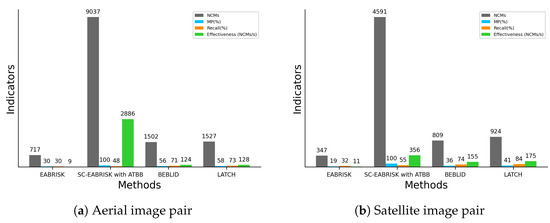 Figure 10 visualizes the image matching results for the imagery datasets used. Similar to the previous results, the number of NCMs is apparently reduced with SC-EABRISK, but the implementation of the ATBB then increases it. According to the results in Figure 6b and Figure 10b, the illumination change between two images may influence the NCMs derived from the SC-EABRISK; therefore, the ATBB process can effectively compensate for this disadvantage. In addition, the results derived from the BEBLID and LATCH methods are similar for both image pairs. This study also observes that the distribution of the matches of the satellite image is more uneven than that of the aerial image pair. Because the grassland in the middle of the satellite image pair presents minor texture variations, feature points may be drastically reduced in this area.