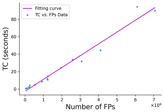 However, the displacements of possibly identical keypoints caused by subpixel-level BRISK detection and extraction in the four images prevent direct color synthesis. To achieve this objective, the proposed method groups four points with very close pixel coordinates emerging in the grayscale and R-G-B images as the most representative keypoints. Thereafter, color synthesis for the feature descriptors is addressed by these four group points from four color images. Compared with color-invariant methods [57,58], the proposed method generates SC keypoints that can preserve the true color information in the image without deteriorating the spectral information. Therefore, the SC descriptors of the most representative keypoints are expected to be more distinctive than those obtained via the grayscale image alone. The arrangement of the SC descriptors is then modified by the ISR pattern, the cell sensitivity, and the distribution of color information across the human retina. Based on this mechanism, image matching can be carried out more efficiently by eliminating unlikely matches as early as possible. Figure 12 shows a linear fitting curve between the TC and the FPs obtained by the eight experimental examples (16 datasets analyzed with the EABRISK and SC-EABRISK operations) to estimate the processing time required when supplying different numbers of FPs. Although the estimation may be biased due to differences in the computer environments, the curve is approximated as TC = 0.000136 × FPs − 2.569 in this study, allowing prediction of the processing time needed when applying the proposed method to different imagery data.