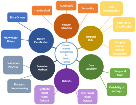Many methods have been used for the recognition of human activity. However, this field still faces many technical challenges. Some of these challenges are common to other areas of pattern recognition (Section 2) and, more recently, on automatic features extraction algorithms (Section 3), such as computer vision and natural language processing, while some are specific to sensor-based activity recognition, and some are even more specific to the smart home domain. This field requires specific methods for real-life applications. The data have a specific temporal structure (Section 4) that needs to be tackled, as well as poses challenges in terms of data variability (Section 5) and availability of datasets (Section 6) but also specific evaluation methods (Section 7). The challenges are summarized in Figure 2.
