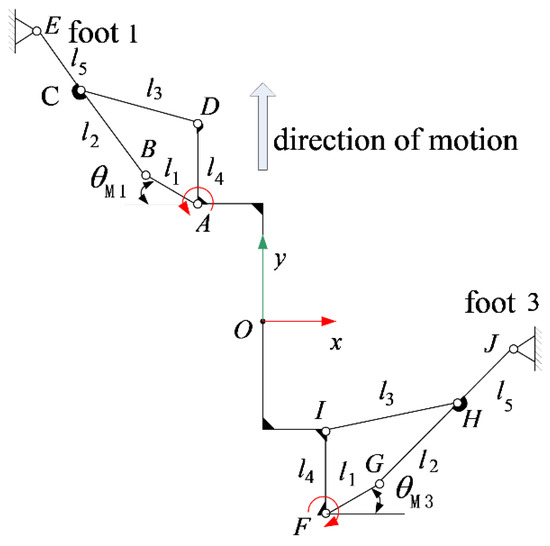 Regardless of the gecko-like robot’s feet skidding, the robot completed linear motion in a diagonal gait, requiring the diagonal support foot to swing in the same direction while reducing the swing in other directions. If foot 1 and foot 3 were in the support state, then foot 2 and foot 4 would be in the suspended swing state, and the leg-lifting joint would be in the static state. The diagonal gait linear motion analysis sketch of the gecko-like robot is shown in Figure 3.