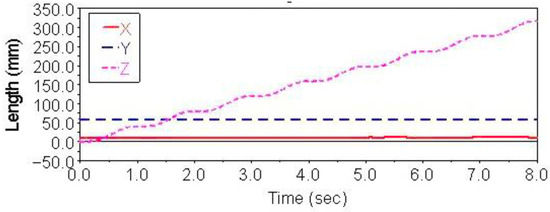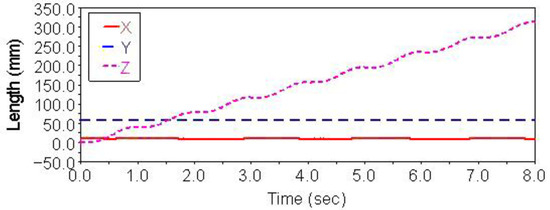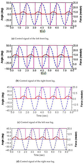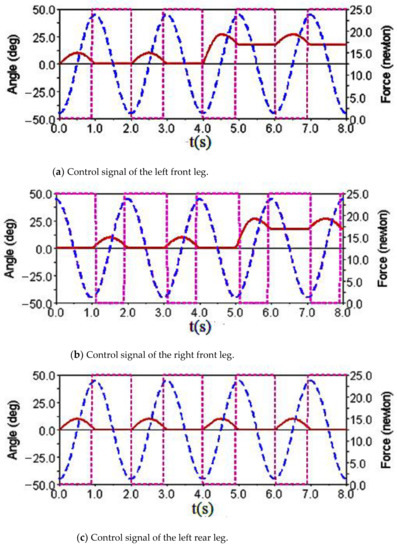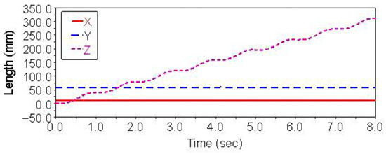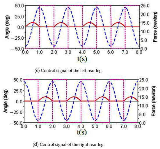 Gait simulation was carried out in the automatic dynamic analysis of the mechanical systems (ADAMS) environment. The control signals of each foot are shown in Figure 4. It can be seen from this Figure that the left forefoot was moved in the same phase as the right hind foot, and the right front foot moved in the same phase as the left hind foot. The ipsilateral forefoot and hindfoot phases differed by half a period. , and are indicated by the red solid line, the blue dashed line and the purple dashed line, respectively. The displacement curve of the robot’s center of mass on the X, Y and Z axes is shown in Figure 5. The displacements in the X, Y and Z directions are indicated by the red solid line, the blue dashed line and the purple dashed line, respectively. It can be seen from the Figure that the displacement in the Z direction was the largest, because the robot moved in a vertical direction. The displacement in the Y direction was zero, because there was no motion in the Y direction, and the displacement in the X direction was almost zero, because there was also no motion in the X direction. The very small displacement change in the X direction was due to a motion error caused by slipping and other factors. The diagonal gait adopted in straight walking is shown in Figure 6. It can be seen from the Figure that a better movement effect was achieved by the planned gait.