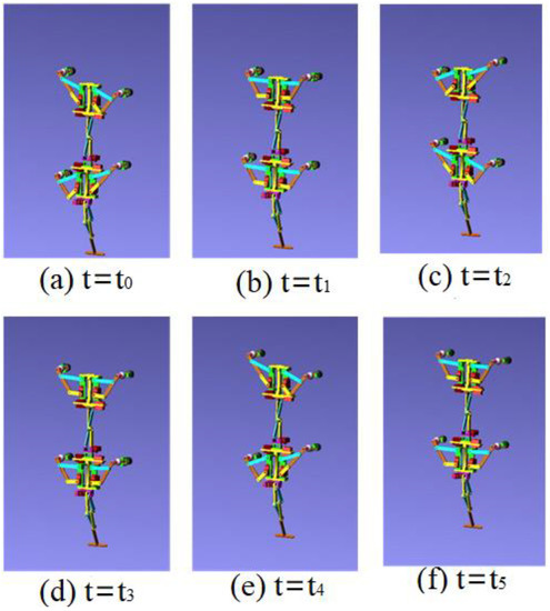 Diagonal gait for walking straight forward in ADAMS in different moments.