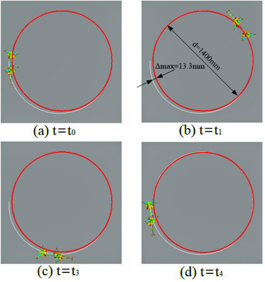 Gait simulation was also carried out in the automatic dynamic analysis of mechanical systems (ADAMS) environment. The control signals for each foot are shown in Figure 7, among them, , . It can be seen from the Figure that the robot moved according to the corresponding gait. The displacement curve of the center of mass of the robot on the X, Y and Z axes is shown in Figure 8. It can be seen from the Figure that the displacement in the X and Z directions changed with time, because the robot moved in the X and Z planes. The displacement in the Y direction was zero, because there was no motion in the Y direction. The effect picture of the robot walking with a turning gait is shown in Figure 9. It can be seen from the Figure that a better movement effect was achieved according to the planned gait. Due to friction and other factors, there was a relative slip between the electromagnetic sucker and the wall, and the maximum deviation between the trajectory of the mass center and the theoretical planning trajectory, that is, a circle with a diameter of 1400 mm is 13.3 mm.