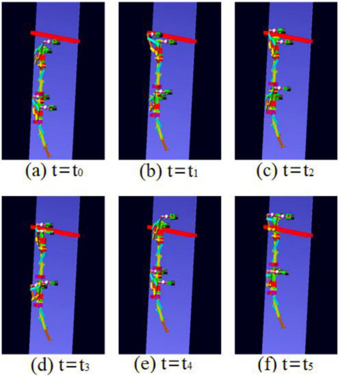 - Feet 1 and 3 of robot dropped, and then feet 2 and 4 adsorbed with the wall. At this time, all four robot feet were in the adsorption support state.
