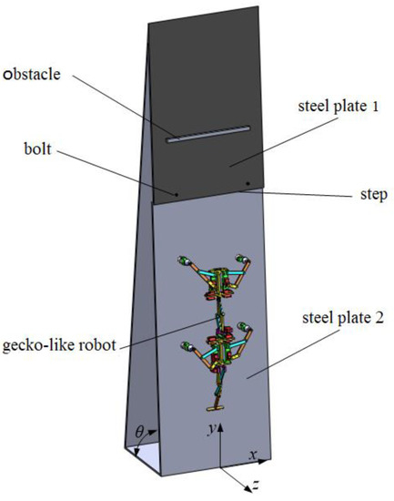 In order to achieve good simulation results, some constraints, including fixed constraints, rotation constraints, ball hinge pair and spring constraints, adsorption force constraints and contact force constraints, needed to be imposed. Under these constraints, the gaits adopted by the gecko-like robot, such as walking, turning motion, obstacle-crossing, and step-climbing, were planned. The experimental system included steel plate 1, steel plate 2, an obstacle and the robot. Steel plate 1 and steel plate 2 were made of ordinary carbon steel with a width of 400 mm, and the inclination () between the steel plate and horizontal plane could be adjusted. Steel plate 2 and steel plate 1 were connected by bolts to form a step with a height of 8 mm. The size of the obstacle was 12 mm × 12 mm × 220 mm. The adsorption method was electromagnet adsorption, and the maximum adsorption force of the electromagnet was 25 N. In simulations and experiments, the gecko-like robot successfully achieved walking, obstacle-crossing, and step-climbing in the vertical plane, based on the stable rhythm control signals. The simulations and experiments validated the feasibility of the CPG motion control model.