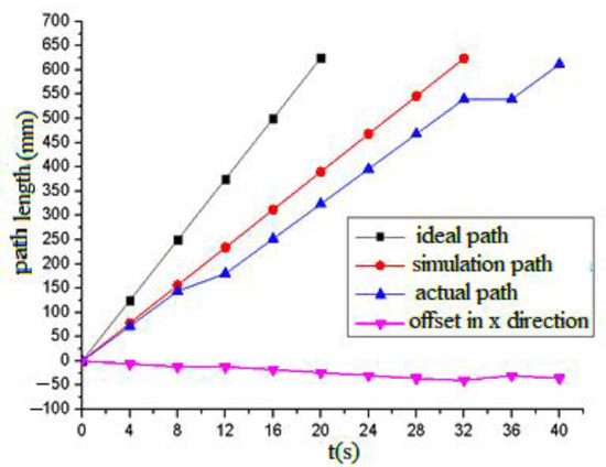 Figure 18 shows the comparison curve of the ideal path, the simulation path and experimental path without slips when t equals two seconds and equals 90°. The ideal path, simulation path, experimental path and offset in the x direction are indicated by the black solid line with squares, the red line with dots, the blue line with arrows and the pink line with downward arrows, respectively. It can be seen from the Figure that the ideal path and simulation path were linear with time, and there was a certain deviation between them. Due to the influence of the slip and other factors, the deviation between the experimental path and the simulation path was larger, especially for crossing obstacles, where the deviation changed greatly, but this did not affect the actual experimental effect. In 12 s and 36 s, the robot crossed the steps or obstacles by increasing the swing of the leg-lifting joint. At this time, the electromagnetic chuck and the steel plate formed a certain angle, resulting in a decrease in the magnetic induction intensity, a fluctuation in the adsorption force and the relatively large slip of the robot.