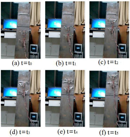 Video screenshots of the gecko-like robot walking in plane, climbing steps and crossing obstacles are shown in Figure 19. In the actual experimental environment, by changing the experimental method and constantly optimizing various parameters, the experimental effect was improved. After many experiments, the gecko-like robot steadily walked, climbed steps and crossed obstacles in the vertical plane.