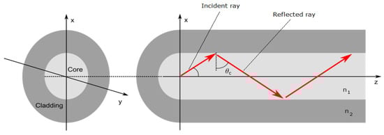 Figure 2 illustrates the light propagation through an optical fibre. If the angle of incidence of the incident ray is greater than the critical angle then the light ray gets reflected and confined within the core, else it is refracted. The critical angle is defined by Snell’s law and is given by: