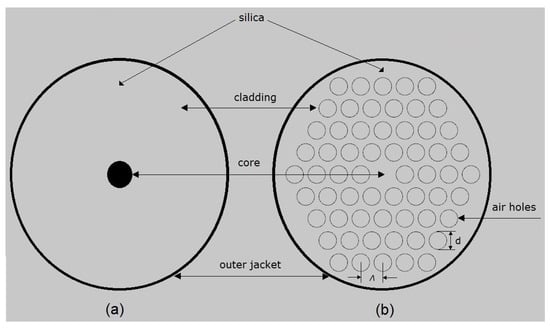 Figure 3a,b show the cross-sectional view of the structural difference between a standard step-index SMF and a solid core PCF with microstructured cladding. The geometrical parameters of PCF comprise: pitch which is the cladding hole centre to centre distance and the diameter of the cladding air hole .