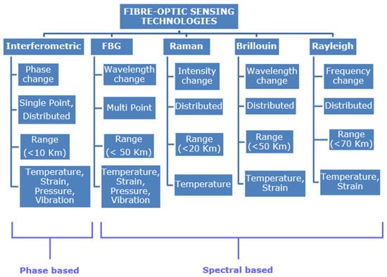 Optical fibres can be used as sensors for sensing various physical parameters like temperature, pressure, strain, etc., wherein the parameter to be sensed modulates various properties of light. From the basic principle of light propagation through an optical fibre, the light propagation changes when subjected to varying environmental conditions such as temperature and strain. By analysing the changes of the light properties through the fibre, the environmental conditions themselves can be determined. Fibre-optic sensors have been designed and developed to measure a wide range of physical parameters such as pressure [33], temperature [34], position [35], etc. Light propagated through an optical fibre can be characterized by parameters such as intensity, phase, wavelength and polarisation. The detection of the changes of these parameters as the optical fibre interacts with external perturbations can lead to the design of optical sensors capable of measuring a variety of physical parameters. As a result, fibre-optic sensors can be based on intensity measurement, phase (interferometric) measurement, spectral (wavelength), polarisation modulation and also the physical quantity they measure and their effect on the electric field of the optical signal. Existing optical fibre sensing technologies are categorised based on the effects used to measure physical phenomena and also the light modulation techniques used. In optical fibre sensors information is conveyed as a variation in intensity, frequency, phase, polarisation, wavelength or their combination of light [36]. Optical fibre sensing techniques like Raman [37], interferometry (Fabry-Perot, Michelson) [38,39,40], fibre Bragg gratings (FBG) [41], Brillouin [42], etc., are proficient to monitor different physical parameters such as pressure, temperature, strain, chemical concentration, flow, etc. Extensive research into the advancement of optical fibre technology for variety of applications have been ongoing for the past 30 years which have laid the technical background for the various categories and their applications are expanding rapidly.